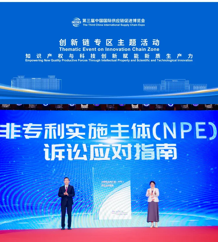 7月17日,在第三届中国国际供应链促进博览会上,以“知识产权与科技创新赋能新质生产力”为主题的创新链专区主题活动顺利举行。在这次活动中,由北京市知识产权公共服务中心(北京市知识产权维权援助中心)和中国贸促会商事法律服务中心共同编写的《非专利实施主体(NPE)诉讼应对指南》(以下称“《指南》”)正式发布。